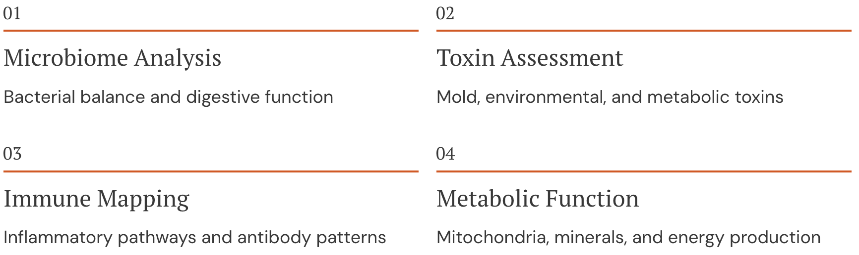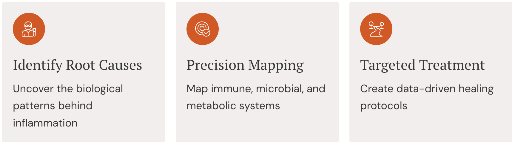 My approach uses advanced microbiome, toxin, immune, bile acid, mitochondrial, and intestinal barrier testing to reveal the root causes driving Crohn's and Colitis. These tests show why inflammation is happening and which pathways must be corrected for long-term healing.